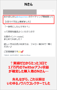 再現性が段違いです。僕はTwitterのフォロワーを1万も2万も抱えている人や、師匠に数百万払った人のように「すごい経験や実績」が一切ないです。純粋にたった1人で、文章の力だけで副業1年で1,000万達成したスキルを教えるので、非常に高い再現性があります。 |